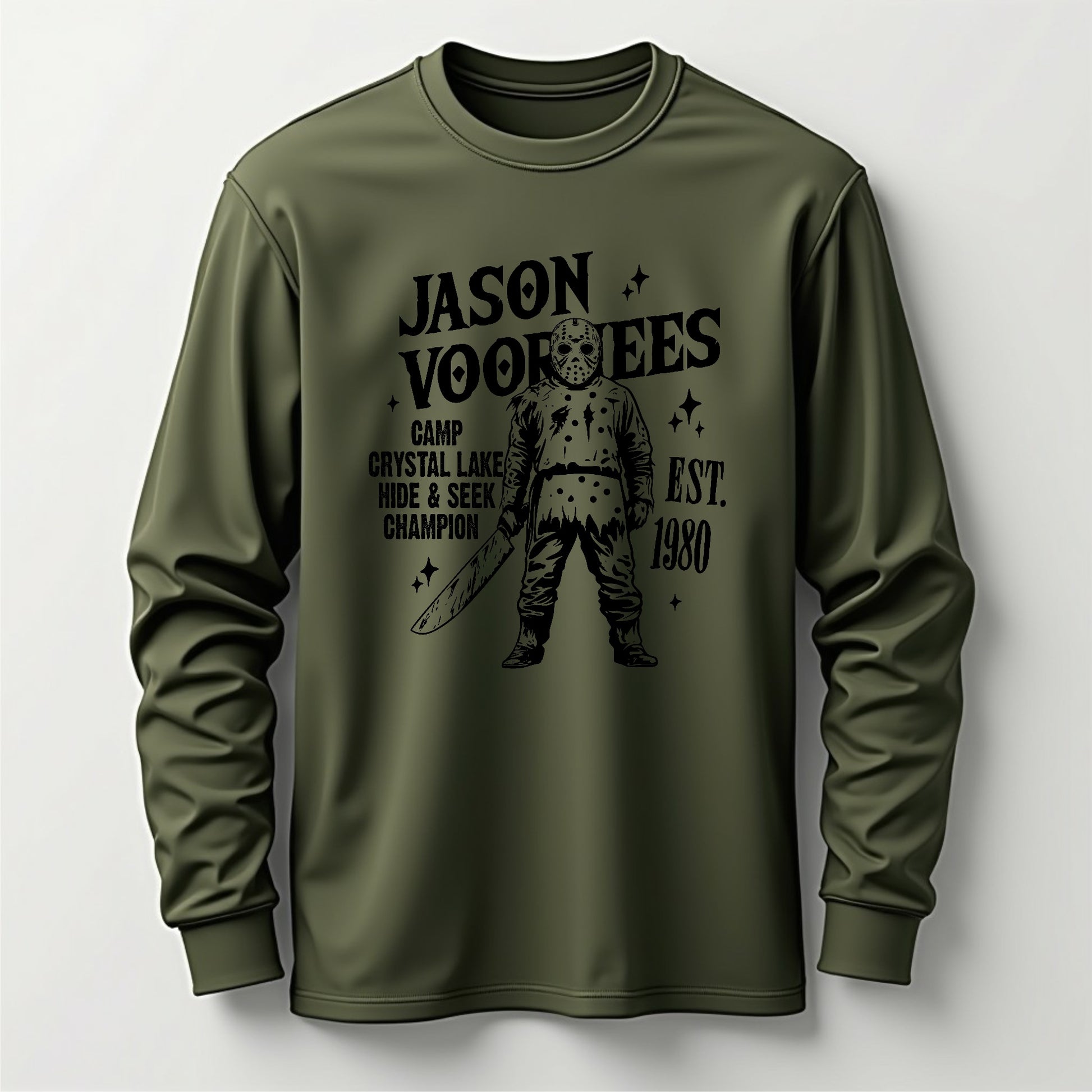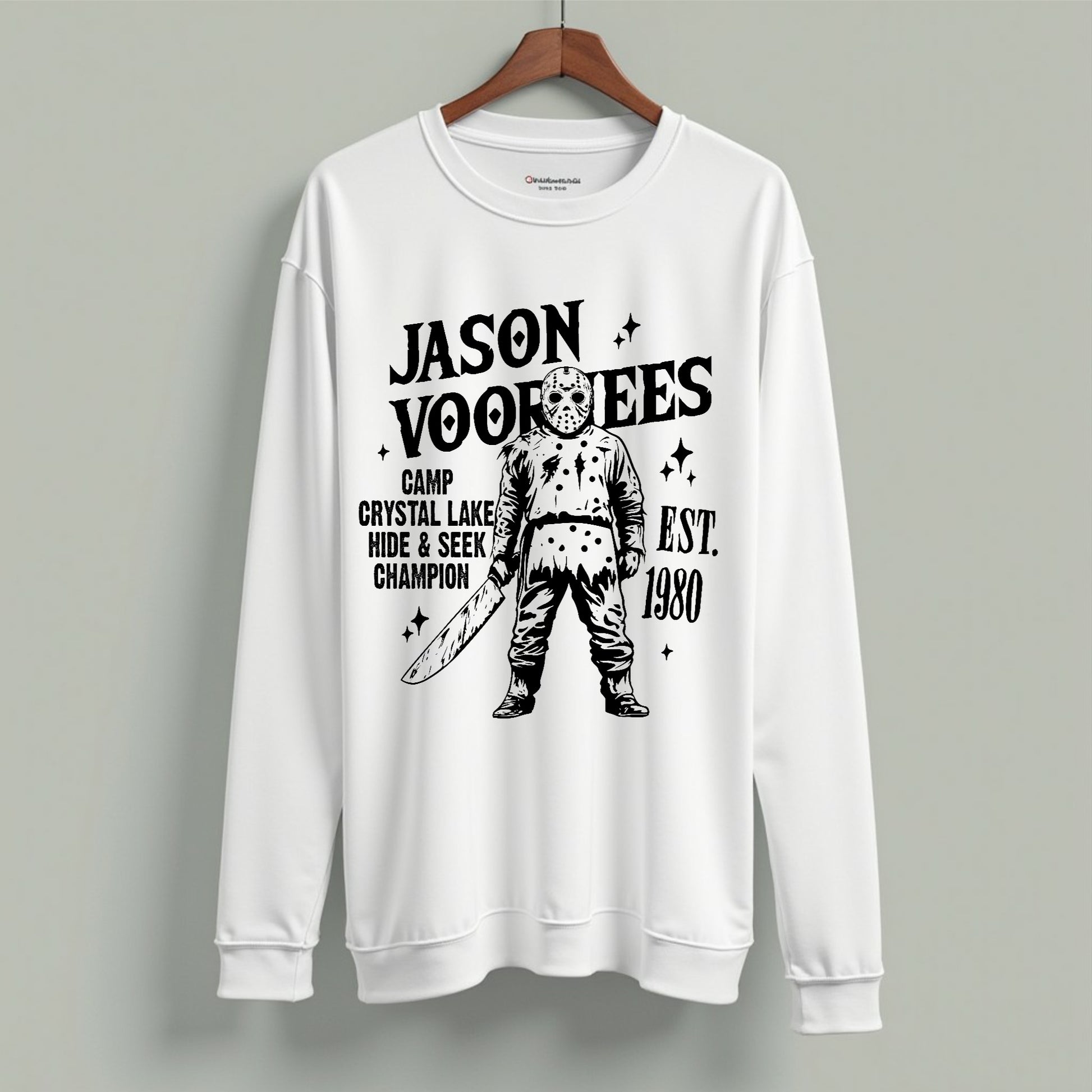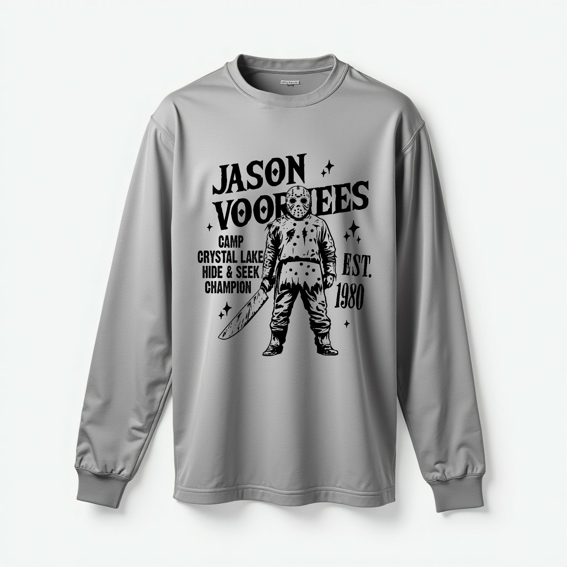 This long sleeve crewneck T-shirt is made from 100% cotton, delivering breathable comfort and a soft texture perfect for daily wear. Showcasing exclusive designs from the Jason Halloween collection, it merges iconic horror elements with sturdy fabric, ideal for expressing your fandom while remaining comfortable during the spooky season.